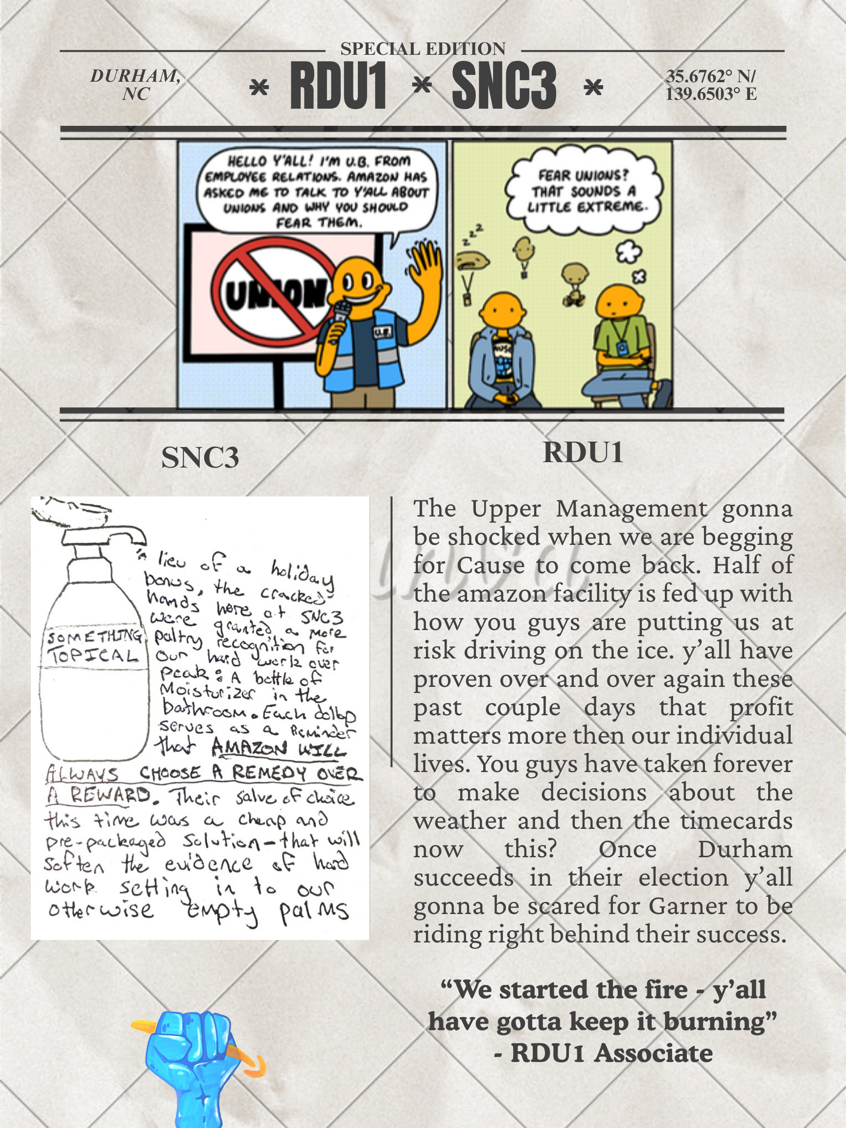 When Amazon warehouses began filling up farm towns and irretrievably changing the nature of these towns, I decided to apply to the University of North Carolina to see if I could study these transitions. To understand this transition, I engaged in four years of covert ethnography and union organizing within Amazon’s distribution network. I have worked the warehouse floor picking and packing packages, organized alongside my peers, and documented the physical and social toll of trying to make a living in the South on an Amazon wage. Throughout this time, I have worked tirelessly to understand how the body is consumed by work and to help build worker power in the worst state for workers in the U.S., according to Oxfam. Below are examples of the Videography work I have done that will be a part of a long-form documentary, the social media page for the Union that I manage, and a newsletter I managed and helped design with a team of workers to educate our warehouses on unionization